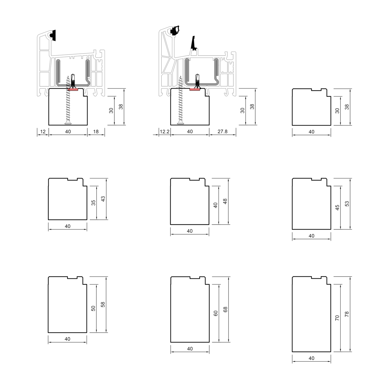 Die profilbezogenen Bankanschlussprofile für Kunststoff-, Holz- oder Aluminiumfenster sind in diversen, unterschiedlichen Formen und Höhen erhältlich.