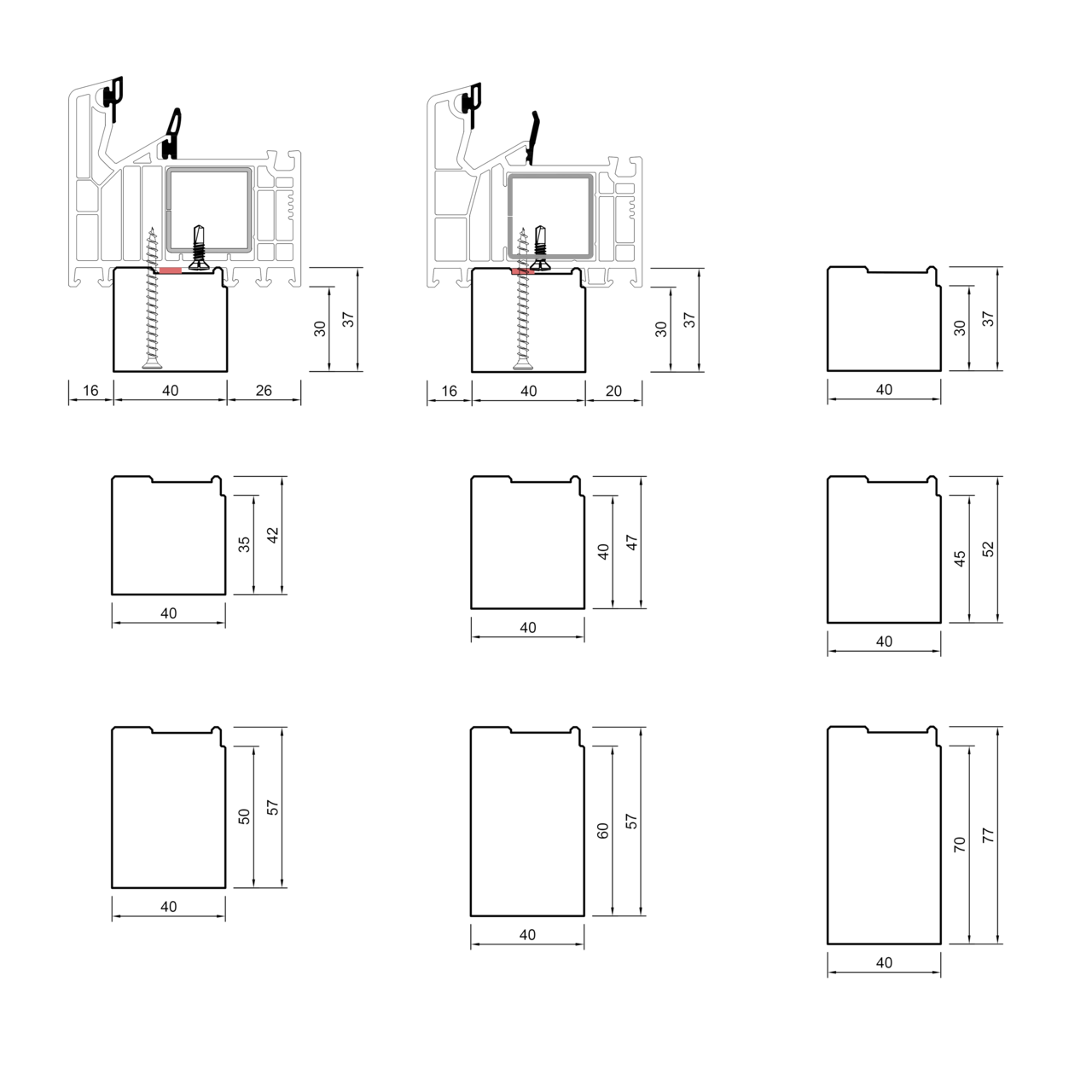 Die profilbezogenen Bankanschlussprofile für Kunststoff-, Holz- oder Aluminiumfenster sind in diversen, unterschiedlichen Formen und Höhen erhältlich.